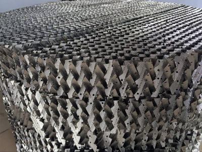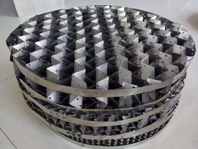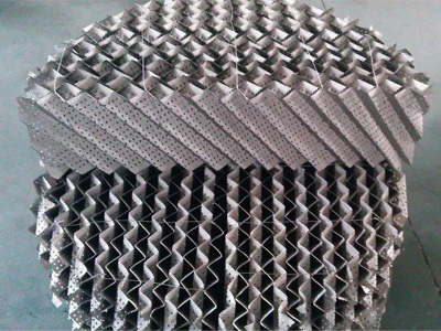 丝网波纹填料是用于气液传质分离塔设备中的填料,是由不锈钢丝网压制成的若干波纹片,按一定的直径要求垂直叠合组装成的盘状规整填料。相邻波纹片的波纹倾斜方向相反,上下相邻填料盘的波纹片成90°交叉。